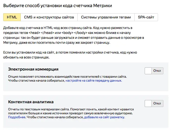 После создания система сгенерирует HTML-код — скопируйте и вставьте его в код сайта (ближе к началу между тегами <head> или <body>). В некоторых CMS и конструкторах есть отдельные поля для счётчиков аналитики.
