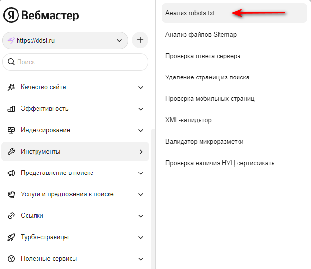 Проверка robots.txt в Яндекс Вебмастере доступна даже без подтвержденных прав на сайт. Инструмент расположен в главном меню, в разделе «Инструменты».