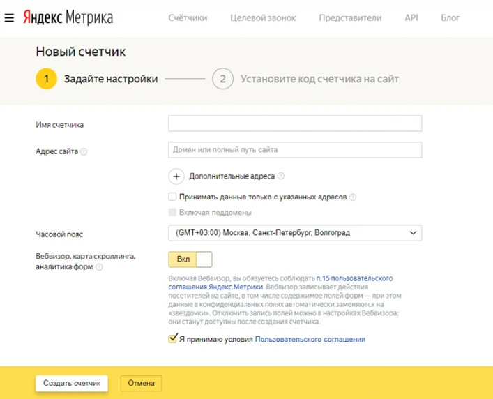 Если у вас еще не создан счетчик, сначала добавьте его на главной странице Яндекс.Метрики, после чего можно сразу активировать Вебвизор и аналитику форм.
