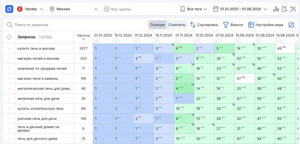 К нам обратился маркетолог компании Дом Печей с запросом на продвижение сайта. После тщательного анализа ниши мы пришли к выводу, что уровень конкуренции позволяет достичь высоких позиций в поисковых системах и привлечь значительный объем трафика. В кратчайшие сроки был разработан план работы и подготовлено коммерческое предложение, которое клиент одобрил. Сразу после подписания договора и получения аванса мы приступили к реализации проекта.