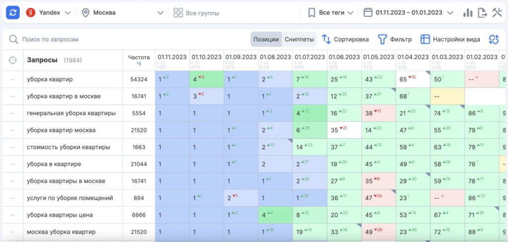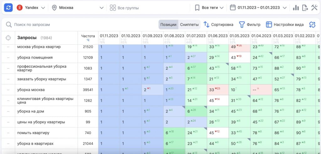 Результат: спустя 3 месяца SEO продвижения сайт занял лидирующие позиции по большинству тематических коммерческих запросов, стал получать много органического трафика, который еженедельно подрастал и растёт до сих пор за счёт постоянного развития проекта.