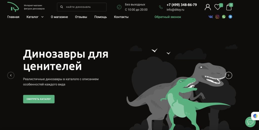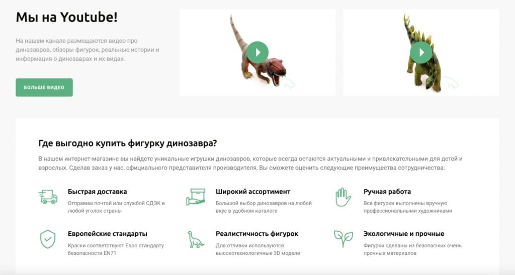 Наш проект. Задача — создать классный сайт для продажи фигурок динозавров. Важно было сделать самый быстрый, простой для восприятия, удобный, технически продвинутый интернет-магазин, способный стать лидером в своей нише бизнеса.